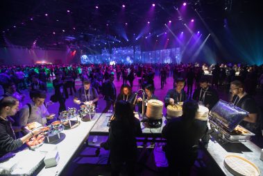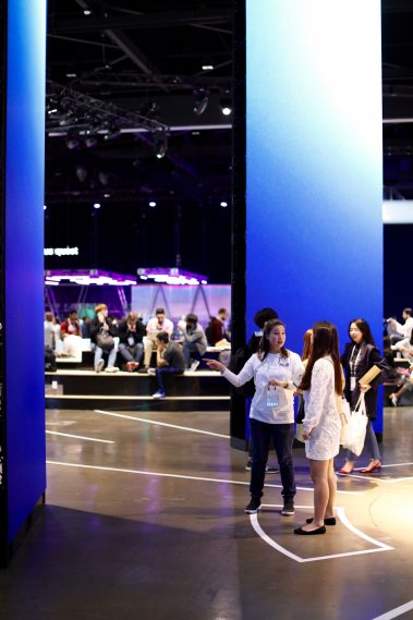 In the expansive 90,000+ sq. ft. Festival Hall, intricate demonstrations of all types of proprietary Facebook tech were on full display. From games to networking apps to instructional classroom sessions, the two-hall space was full of digital eye candy. The crown jewel of the room was the “future chandelier” – an extraordinary interactive exhibit composed of five double-sided LED panels, each 6’-6” wide by 18’ tall, with exclusive camera tracking, organic pixel chorography that moved with attendees’ physical gestures, and custom 10.1 audio surround sound. It was truly an immersive experience.