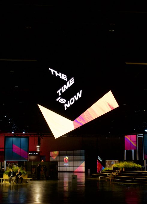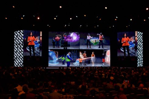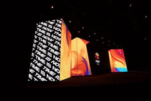 In a world where lines blur between reality and imagination, FNTECH was delighted to help showcase this extraordinary digital vision on the keynote stage. With three extra-large projection shapes made from more than 425 panels of 2.6 pitch Roe Black Diamond LED totaling a whopping 59,311,040 pixels, the larger than life imagery was a sight to behold. Pushing the graphics to these massive screens required 7 separate inputs from the E2, and 10 500-foot fiber runs. 120 speakers helped the audience feel completely immersed, while 1,764,000 watts of 120-volt power kept all the various engines silently humming.