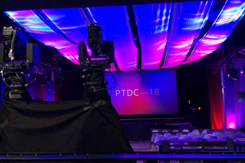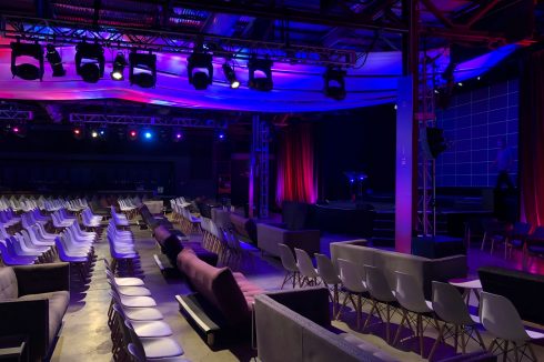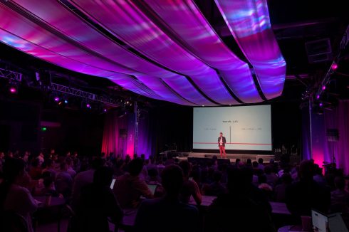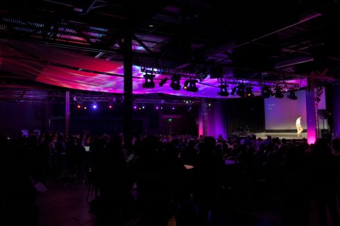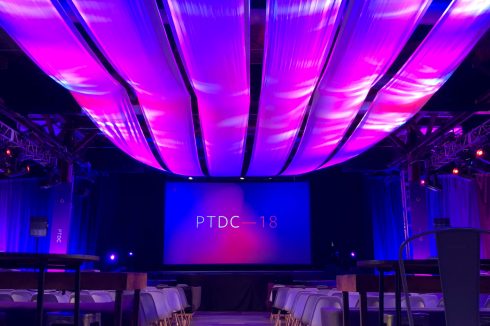 Since the PyTorch community is comprised of many original thinkers, Facebook wanted to keep the event design organic and flowing. To achieve this colorful, undulating look, we rigged 1920 square feet of white muslin over the audience and utilized more than 70 lighting fixtures using 1055 DMX control channels to bring it “to life” and achieve different looks throughout the day.